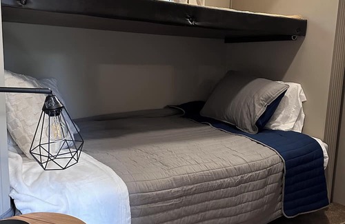 The outside of the rv is equipped with a grill, a storage compartment filled with yard toys, grilling accessories, bug spray, sunscreen and a fire pit! (Firewood not provided) We hope you can enjoy this relaxing retreat just like we do!