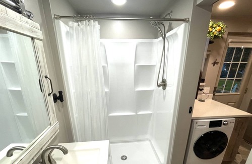 The tiny home is a detached structure at the end of the driveway on a shared property with the owner. It's tucked away in the backyard surrounded by gardens. The inside is open concept with a kitchen, bathroom, living room, and two sleeping areas. The main floor has a Day Bed that converts from twin-to-king and the 2nd story loft has a queen-size bed with access via a telescoping ladder. (If using the 2nd story loft, make sure the ladder is locked/fully extended, watch your head with beams, and utilize the sliding gate for additional safety)