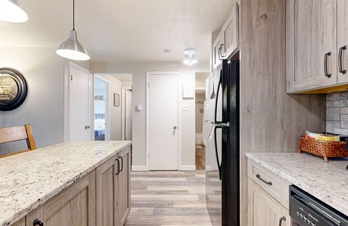 Nestled in the charming town of Dillon, this cozy condo offers a comfortable living room with a plush couch, reclining chair, and Roku TV for relaxing evenings after a day of outdoor adventures. The fully stocked kitchen with barstool seating is perfect for enjoying home-cooked meals with your loved ones.