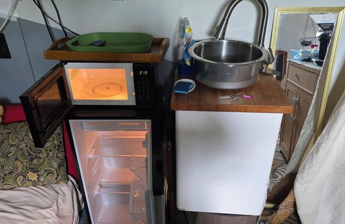 The cozy space features a queen bed, and bathroom with a bathtub and shower, a desk and essential amenities like heating, AC, and an iron, hairdryer fully fitted with refrigerator, freezer, coffee makers, dishes, pots, pans, television, induction cooktop, Nestled in a serene neighborhood,