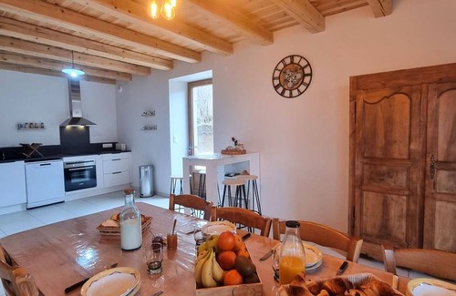 Discover "La maison de campagne" for 10 people, completely renovated, this 160m² cottage offers all the necessary comfort for a friendly stay. On the ground floor, a large, bright living room invites you to relax in front of the wood stove, while the open, perfectly equipped kitchen opens onto a friendly and spacious dining room. The upper floor serves four welcoming bedrooms, two modern bathrooms and a separate toilet. This cottage combines the charm of old stones with contemporary comfort. Nb: the exterior of the cottage is currently being developed to soon offer a green and welcoming setting: the lawn is growing ;) A vacation rental with hiking and discovery in Gumières in the Loire! The Monts du Forez offer an incomparable playground for nature and outdoor lovers. From the cottage, explore the hiking trails, hop on your mountain bike to crisscross the forest paths, or opt for a peaceful bike ride. The region's natural wealth makes it a privileged place to recharge your batteries! Lovers of eco-tourism will be delighted by the authenticity of the landscapes and the diversity of activities.