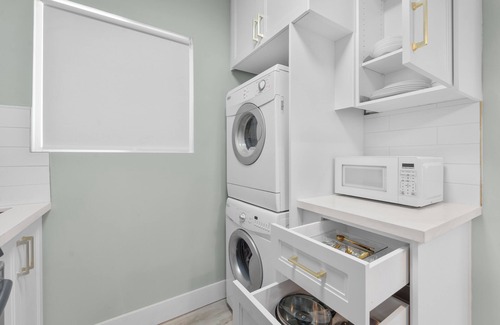 The private top suite features two bedrooms, a queen-sized bed, a double bed, and a pull-out couch in the living room, accommodating up to six guests. Enjoy the open concept living and dining area with a fully stocked kitchen, smart TVs, and board games for family fun. Our place is equipped for both long or short stays to make your holiday one to remember.
