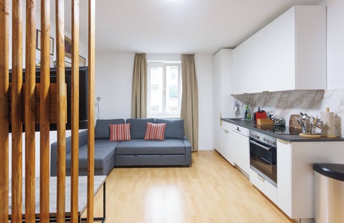 As you enter, you're welcomed by a cozy atmosphere that instantly feels like home. The open-plan living area, decorated in classic Viennese style, invites you to relax on the comfortable sofa while enjoying a book or your favorite shows on the smart TV. The sofa bed accommodates two additional guests.