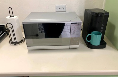 Inside the studio, you'll find all the comforts of home, including a well-equipped kitchenette with a mini fridge/freezer combo, microwave, Keurig coffee maker, and all the dishware and silverware you need. The living space is thoughtfully designed with a queen-sized bed, a cozy loveseat, a table for two, and an adjustable flat-screen TV that you can enjoy from the comfort of your bed or the loveseat.