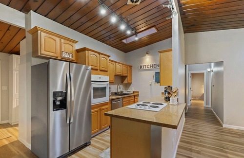 Our inviting property offers a comfortable stay with three bedrooms and two well-appointed bathrooms, ensuring ample space and convenience for you and your family or group. For those who need a dedicated workspace, we provide a designated area where you can focus and be productive. Nestled in a quiet and friendly neighborhood, you'll enjoy peace and tranquility, yet we're conveniently close to the city's attractions and amenities. And when it's time to relax, our covered patio features a soothing hot tub for your enjoyment. Meanwhile, the kids can have a blast in the backyard with a playset that will keep them entertained.