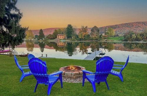 100' of lake frontage providing direct lake access w/ expansive 28' dock, 4 complimentary kayaks for guest use with life jackets, and swimming area with floaties. Firepit w/ 5 Adirondack chairs overlooking the lake. 300 sqft lakeside deck with expansive views of Little York Lake.