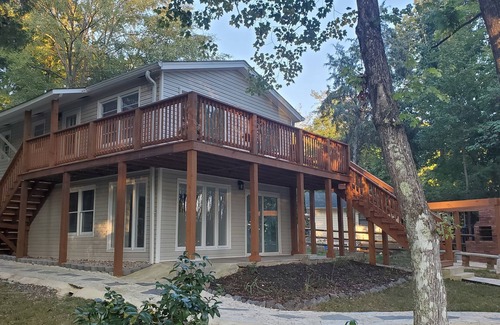 Relax with the whole family at this peaceful lakehouse retreat, nestled on a quiet cove of Lake Wylie. Enjoy your days out on the lake on the provided Kayaks or paddle boards, and then huddle around the fire with your loved ones in the evening. With two indoor wood-burning fireplaces, a fire table on the deck overlooking the lake, and a fire pit in the backyard, you'll have plenty of options. Grill up some steaks on the outdoor brick BBQ and then relax on the porch swing or comfy egg chairs.
