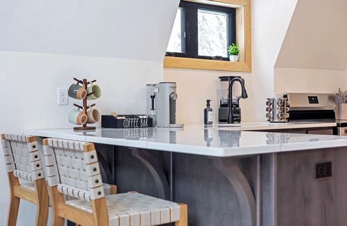 Escape to 'The Black Diamond' - a modern A-frame nestled in the Pocono Mountains. This stunning A-frame blends rustic-meets-mid-century design, offering couples, families and friends the perfect mix of warmth and adventure. After exploring waterfalls or skiing nearby slopes, unwind in the starlit hot tub, cuddle by the fireplace (with popcorn from the retro machine!), or soak in the soaking tub - every moment becomes unforgettable. Book your mountain getaway today! As you step through the front door, the soft glow of the indoor fireplace wraps you in a cozy embrace, setting the stage for an unforgettable escape. The open-concept living room features a plush sofa, a flat-screen TV, and even a popcorn machine—perfect for movie nights after a long day of adventure.