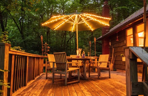 The three season deck is just about every guest's favorite feature; a spacious 16' x 20' with gas grill, teak furniture, tiki torches and deck umbrella complete with lights! Great for entertaining, reading, watching the humming birds, goldfinches, and cardinals all to the backdrop of the burbling creek. To sit out here wrapped in the nurturing embrace of the woods will renew your strength and replenish your spirit.