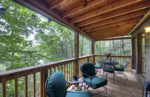 Wake up to fresh mountain air and enjoy the woodland wildlife from the comfort of the covered deck! The cabin's exterior and landscaping, including stone pathways and accent lighting, have been enhanced for your enjoyment. A short footpath leads to the Ivy River., After a busy day, grill out on the deck and enjoy beautiful wooded views of the river from the hot tub.