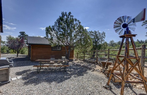Our property is adjacent to the Prescott National Forest. Relax outdoors, gazing at the mountains while listening to the wind blow through the trees. Take a walk around the property or go for a hike or bike ride without having to get in the car and drive. Our log home is situated across from the cabin. Guest privacy is our foremost priority.