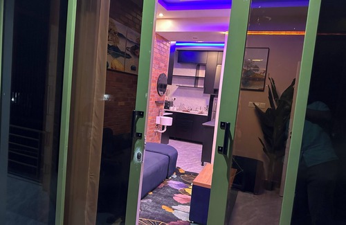 Welcome to your cozy retreat in Karama (Norvege)! This beautifully designed apartment offers a modern and stylish experience with a touch of elegance. Step into a spacious living area bathed in soothing blue ambient lighting, featuring plush navy blue sofas, a unique wooden coffee table, and a vibrant floral rug that adds warmth to the space. The open layout seamlessly connects to a well-equipped kitchen with modern appliances, including a microwave, blender, and stove, perfect for preparing your favorite meals.
