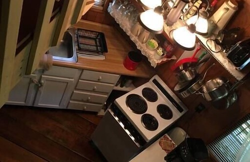 River-front and originally designed with Asian influences, this cozy tree-top cabin makes for an unforgettable & reviving holiday. It has one bedroom in the back of the cabin and another sleeping area with a queen sized memory foam mattress in the loft above the kitchen/living area. This area is appropriate for children and adults up to 220# that can safely climb the pull-down attic steps