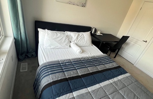 A cozy and inviting retreat designed for comfort and convenience. Enjoy a home-away-from-home experience with a private bedroom, a dedicated bathroom, an in-room fridge for added convenience, and blackout shades for a restful sleep. Stay connected with unlimited high-speed Wi-Fi, and enjoy hassle-free self-check-in via a smart lock. The space is in a quiet and safe neighborhood, with easy access to public transport, restaurants, and local attractions—perfect for both short and extended stays.