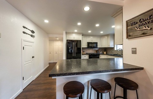 Creekside Cabin is outfitted to suit the needs of a modern vacationer. 4 bedrooms, 2 bathrooms, and picturesque windows! A fully equipped kitchen provides a user-friendly space to cook a meal. Entertainment options like flat-screen TVs mean you can cozy up with a good movie next to the fireplace! A washer and dryer in the cabin are perfect for soggy ski clothes. The large deck is the perfect place to bbq with family and friends!