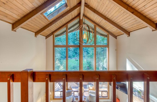 With a serene location on the banks of Clear Creek and two-story windows that frame the river and the surrounding woodlands, Rustling Waters Getaway will help you relax, unwind, and truly get away from it all. This beautiful Mt. Hood A-frame house features a light-filled interior with vaulted tongue-and-groove wood ceilings, a large stone fireplace with a wood-burning insert, and stunning outdoor features that include a private hot tub, a wrap-around deck, a firepit, and a wood swing down by the creek. A riverfront retreat at Rustling Waters is a vacation you'll remember for a lifetime.