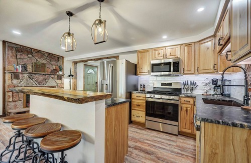 The kitchen is fully stocked and accommodates 4 travelers at the live edge bar. Larger groups? No problem, as there is a table for 6 guests as well!