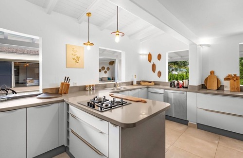 Built over several buildings connected around the central swimming pool, villa Crush welcomes guests in its bright spaces gently blown by the trade winds. Ideally located in Grand-Cul-de-Sac, this contemporary-style vacation home features a comfy living room furnished with a large sofa and an HDTV. The high, white, vaulted ceiling bring a unique cachet and authenticity to this most relaxing indoor space. On the side, the fully-equipped kitchen opens onto the terrace through a bar with stools, the perfect setup to chat over a coffee and enjoy the mild tropical air.
