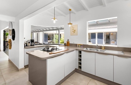 Built over several buildings connected around the central swimming pool, villa Crush welcomes guests in its bright spaces gently blown by the trade winds. Ideally located in Grand-Cul-de-Sac, this contemporary-style vacation home features a comfy living room furnished with a large sofa and an HDTV. The high, white, vaulted ceiling bring a unique cachet and authenticity to this most relaxing indoor space. On the side, the fully-equipped kitchen opens onto the terrace through a bar with stools, the perfect setup to chat over a coffee and enjoy the mild tropical air.