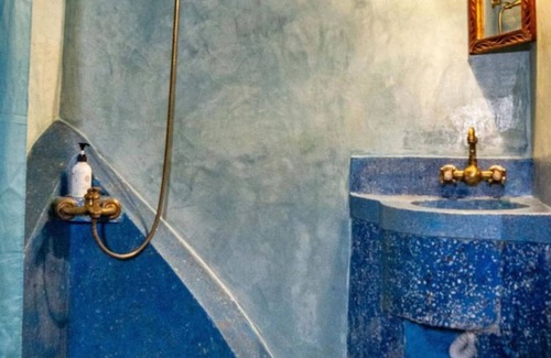 The **bathroom** in **Crystal Blue** is uniquely designed with **colourful polished terrazzo** stone, adding a vibrant and luxurious touch. It includes a **shower** and **handwash basin**, offering all the necessary amenities in an aesthetically pleasing setting.