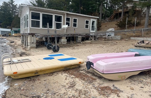 Smaller (90 acres) full recreational lake with great swimming and fishing in a relaxing setting. Water level is returning to normal levels so a wake is allowed from 10am-4pm daily. Lakeside beach house has been raised out of the water and structurally restored. Interior restoration is complete with new flooring, paneling and window trim. New fans and lights have also been installed. There is a mini fridge to store drinks and bait as well. House has a master suite with private bath and two bedrooms with a second full bathroom and shower. Private 3 season screened porch and private deck provide stunning sunset views and a place to play games after dark. One car garage provides area for storage and there is plenty of off street parking.