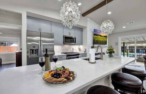 Step outside to your private outdoor oasis, where a covered patio beckons with a comfortable second living area with couch seating, perfect for enjoying the fresh air and serene surroundings. Take a dip in the large pool, bask in the sun on luxurious loungers, or gather around the firepit with chairs for cozy conversations under the stars. The hot tub, accommodating up to six guests, offers a soothing retreat after a day of wine country adventures.