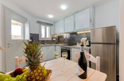 Our accommodation is split into two seperate cycladic houses, thoughtfully designed with your comfort in mind. Both boast an outdoor Jacuzzi with a sea view on their terrace. Ready, for a rejuvenating soak? You'll find everything you need for a pleasant stay, including free Wi-Fi coverage, air-condition and free adjacent parking.