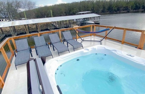 Enjoy our floating cabin, located on the backwaters of the Mississippi River! This luxurious cabin was just built and has everything you need for a fun or relaxing getaway. This cabin has a custom kitchen, 3 queen beds, 1 queen sofa sleeper, 1 bathroom, and a beautiful rooftop deck with a hot tub!