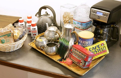 Drip coffee makers are provided with 2 flavors of sealed coffee packages—Maxwell House medium dark and dark roast Cafe Bustelo. You may take home whichever package you open if you'd like; open packages will be thrown out. There is also a kettle with green and black tea bags and a few hot chocolates. We also provide 4 organic milk boxes and some munchies.