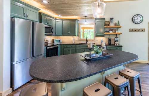 This Bryson City Cabin rental offers breathtaking mountain views and seclusion. With its three bedrooms, two bathrooms, and the ability to sleep up to seven guests, it’s an ideal spot for a family vacation or a getaway with friends. The cabin’s bright and cheerful interior, complete with a living room that boasts cathedral ceilings and floor-to-ceiling windows, offers a comfortable and inviting space. The large flat-screen TV and gas fireplace add to the cozy atmosphere. The fully-stocked kitchen is perfect for preparing meals, and the coffee bar is sure to be a hit with the whole family. The main level features two comfortable bedrooms and a full bath, providing privacy and convenience.