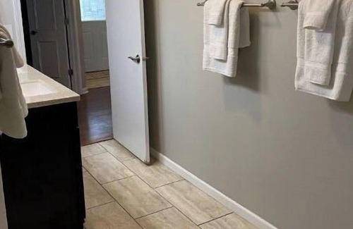 This walkout ranch on a quiet street is perfect for business, pleasure, and game day stays. You are welcomed with an open concept living room/dining room/ kitchen area. Attached to the dining room is a glass sliding door that leads out to an upper deck where you can sit out and enjoy a cup of coffee and lake view in the mornings. The main level also includes a large bathroom with double sinks, a corner shower and linen closets. Just to the left of the entry door is a bedroom with a closet, desk, and double bed. The second bedroom includes two double beds, a double closet, dresser, nightstand with lamp and desk. The master bedroom has a king bed set with nightstands, lamps, desk, dresser walk in closet and bonus closet. The fourth bedroom is in the walkout basement and includes 2 double beds, a dresser, closet, and desk. Relax in the nicely furnished basement bonus room which is adjacent to the conference area which seats 14 and is equipped with an overhead projector.