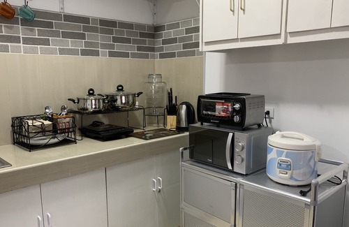 This house has complete amenities plus more. It has a smart big screen TV with WIFI. Guest can use the house phone make local phone calls if they want to order from fast foods. Kitchen is complete with an induction cooker, microwave, fridge, electric kettle, rice cooker, stainless pots & pans, plates & utensils. It has a big front patio with a "dirty kitchen" or a place to cook outdoors with electrical outlets. There's a nice balcony that opens to the 2 rooms upstairs. Two rooms has new a/c. Third room with fan. The bathrooms has hot & cold showers & bidet. Clean linen are provided with fresh towels.