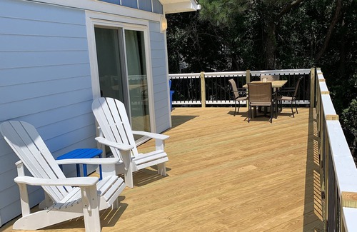 Master Bedroom has a king size bed and has private full bath (shower). Second Bedroom has a queen size bed. Third bedroom has a pyramid bed - - full size below, single on top bunk and 32" HDTV. Second bath in hallway (tub) has a washer and dryer. The "Great Room" includes a large living area with a 37" HDTV, dining area that seats 6, breakfast bar in kitchen area that seats 3, and a well equipped kitchen for cooking "in". A Weber charcoal grille is located outside. The wraparound deck faces south and east and has morning and late afternoon shade (east side) and sun for most of the day (south side).