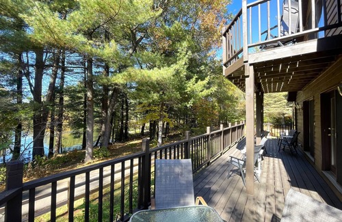 This spacious 3 bedroom, 3 bath, 2 level lakeside home is ideal for your next Dells vacation. Located next to Spring Brook Lake, this home is a tranquil oasis where you can relax to the max. Enjoy your morning coffee on the deck that wraps the entire back of the house and has splendid views of the lake and the surrounding pines. A charcoal grill, firepit and seating area graces the backyard - roast marshmallows and tell stories around the campfire in the evenings!