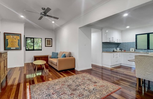 Step inside and you’ll find a peaceful open living space, a well-equipped kitchenette, and a cosy queen bedroom surrounded by lush bushland. Watch the light dance through the trees as you enjoy breakfast at your own dining table, or settle in with a book on the couch after a day at the beach.
