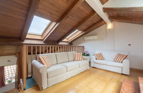 Totally renewed wide and elegant split level attic on the third floor situated in the historic centre of Bologna In via Santo Stefano 88. Entrance in the living room with hardwood floors and wooden beams inclusive of a dining area and a fully equipped kitchenette. The bedroom is provided with a comfortable king size bed and a large, marbled bathroom. On the upper level there is a beautiful terrace overlooking the city and a living room with a single sofa bed. Pets allowed with a supplement of 20.00 per pet per stay