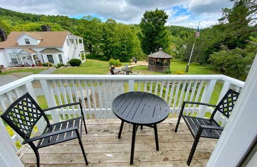 Come enjoy this upstairs King suite with living room, pull-out sofa and your own balcony. We provide firewood and fire starters for the fireplace. One full bath with double sink, bathtub and separate shower has towels, toilet paper, shampoo, conditioner, body lotion and other toiletries. You'll also have a mini fridge, microwave, and coffee maker. We provide Keurig K-cups, tea, sugars, and various snacks, all complimentary. Enjoy dinner in our farm-to-table restaurant at our Historic Inn. Sorry, we cannot accommodate pets.