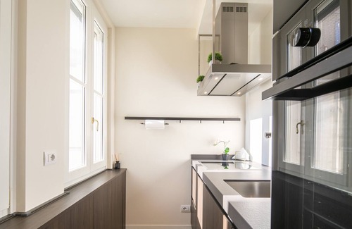 - a well-lit kitchen fitted with all the latest household appliances, such as an oven, microwave, dishwasher, induction hob and fridge, as well as a full utensil set, including pans, plates, cutlery and so on.