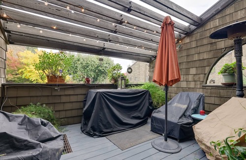 OUTDOORS: Furnished deck w/ outdoor seating, heat lamp, sun umbrellas, plants
