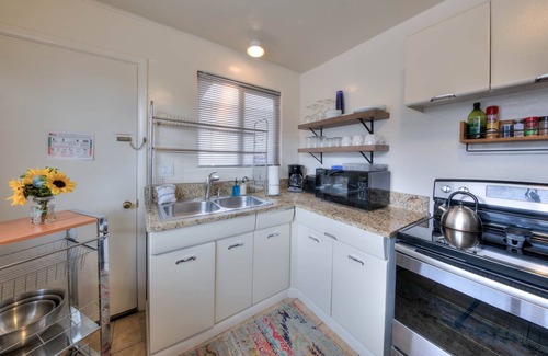 Desert Gardens #1 is a unique and exceptional downtown property that provides both an ideal downtown location as well as a spacious garden setting.This unit features 2 bed, 1 bath and the bed configuration is as follows: 1 King Bed in the main bedroom and two twin size beds in the second bedroom. The kitchen is fully stocked with utensils and small appliances. All you need is food or walk across the street to Thai Bella and have a fabulous meal! The living rooms feature Samsung smart tv's so Netflix and other tv apps are available.