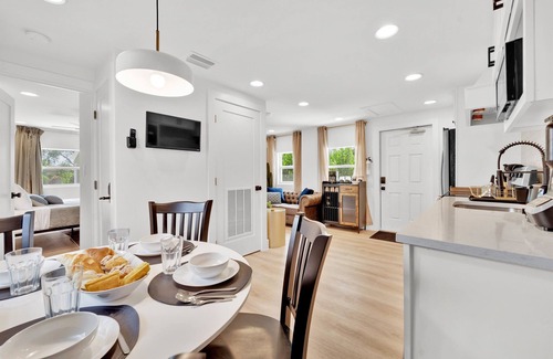 In our vibrant living area, sink into the plush, comfortable sofa and enjoy your favorite shows on the smart TV, conveniently placed for your entertainment. Beside you, a perfect end table keeps your favorite snacks and drinks within reach, creating a cozy atmosphere for relaxed evenings. Step outside to our shared partitioned backyard and enjoy al fresco dining at our chic table for two. Whether it's a morning cup of coffee or a night under the stars, this outdoor space is sure to become your favorite retreat.