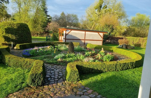 The house stands on a large plot (5000m²) in an idyllic secluded location with a view over the fields and meadows. At the house there is a large garden (2000m² sole use) for our guests with a large terrace incl. Teak furniture and barbecue area, campfire site right in front of the terrace. There is also a small herb corner for you to cook. The old fruit trees in the garden invite you to harvest them yourself.