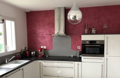 New house full south facing, quiet in small subdivision, 5 minutes drive from downtown and 20 minutes walk, pretty walled garden. Terrace with garden furniture, near the castles of the Loire 25 minutes from Saumur and the abbey of Fontevrault. The travelers have access to the entire house, which consists of two bedrooms with a bed of 180 for one and a bed of 140 for the other, large bathroom with shower and bath, separate toilet, open kitchen equipped on large living-dining room, small office