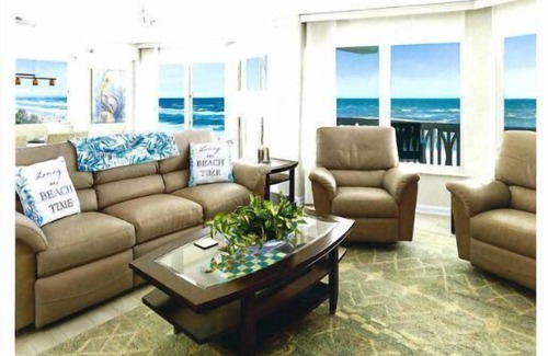 The living room, dining room, and kitchen are combined into "Great Room" open-spaced living area creating the perfect space for family and friends to spend time together. The living room, dining room, kitchen and master bedroom all have a "full-on panoramic, front-facing ocean view", spectacularly framed by floor-to-ceiling wraparound windows and sliders that open onto an Ocean front balcony that spans almost the entire width of the Unit. The balcony creates the ideal location for enjoying the glorious splendor and majesty of the morning sunrise as the sun slowly rises above the surface of the brilliantly sparkling deep blue Sea. It is also a delightful place for enjoying your morning cup of coffee/tea or afternoon/evening glass of wine. With the ebb and flow of the Ocean waves creating the ideal backdrop, the building softly shades the balcony from the afternoon sun creating a perfect spot for reading a favorite novel or simply drifting away into a soothing afternoon nap. On a clear evening, the ocean-front balcony or the sandy beach are great spots from which to view "Space Shuttle Launches". This is a once in a lifetime experience that you will not want to miss.