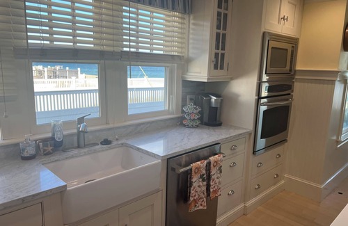 Enjoy an open floor plan with a gourmet kitchen with two stoves and two dishwashers. Fully equipped kitchen with every utensil, pans including lobster pot, blenders, slow cooker and plenty of bowls/platters and outdoor tableware. Large comfortable sectional couch with all the cable options available and TV's in every bedroom. Ocean views from everywhere. Two bedrooms come with their own balconies. The third floor suite comes with its own ensuite bedroom sitting area and bathroom and with a pull out sectional and Front Gate auto fill air mattress that can sleep 2 more people. The separate detached three car garage has a large sectional couch along with a bar and bathroom. Also, there is an air hockey/table tennis table. Outside porch can accommodate many people comfortably and recently rebuilt.. Stand up paddle boards, boogie boards, beach chairs, beach towels and linens all provided.