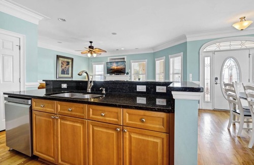Unwind with your family in the family room and luxuriate in the ambiance of the oceanview, the large TV and the gas fireplace offered to you in the large wonderful family room, kitchen and dining room. Enjoy cooking those family meals you don't have time to cook at home in this kitchen with gorgeous granite countertops and fully stocked with everything you need to prepare a special meal. You can all dine together at the large dining table or dine al fresco on the covered deck and be entertained by the ever changing ocean views. NOTE: There is an additional 2nd refrigerator in the entry room downstairs as you enter the house through the cabana area).