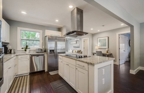 Upon entering the home you are greeted with a large dining area with seating for eight that is open to the kitchen and living room. The master bedroom has a king bed and ensuite bathroom. The second guest room has a queen bed and en-suite bathroom with a shower stall and the third bedroom has a queen bed, desk, and access to the hallway bathroom. The third bedroom also has double doors that lead out to the patio. All bedrooms have comfortable new sheets bedding and towels. The living room has two sofas with one that pulls out into a queen bed and a large wall-mounted TV. Double doors off the living room lead to the private deck and back yard that come alive at night with ambient lighting. The backyard also has a BBQ grill and firepit with seating for a relaxing evening after a long day at the beach or sightseeing. The host has even provided a few games and puzzles for families to enjoy.