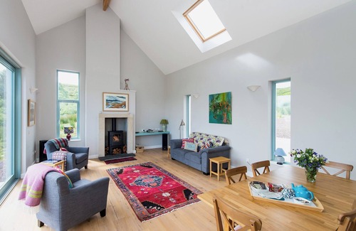 Discover the Applecross Peninsula from this stunning holiday property. Enjoy walks, cycling and climbing or just enjoy the scenery.. Nestled into the hillside, in a sheltered and secluded position, and enjoying some of the most spectacular views imaginable, Tigh An Iasgair is a superb, detached, architect-designed house situated on the Applecross Peninsula. This stunning, warm and light-filled property is beautifully presented throughout, with great attention to detail. The main living area is open plan. With high vaulted ceilings and large patio doors it is exceptionally light and spacious. A large multi-fuel stove acts a focal point. The patio doors open onto a paved patio, a wonderful spot to sit and drink in the views of sea, mountains and open countryside. The grounds lead down to the sea shore below. There is a beautiful sheltered beach 4 minutes away at the end of Fearnbeg village.