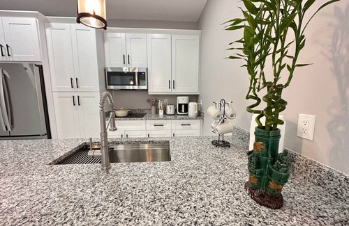 The living area features a new daybed for an additional guest and a pull-out sofa bed, perfect for families or friends. High-speed Wi-Fi and Netflix access make it ideal for both business and leisure. A full-size washer and dryer on-site ensure a comfortable, worry-free stay.