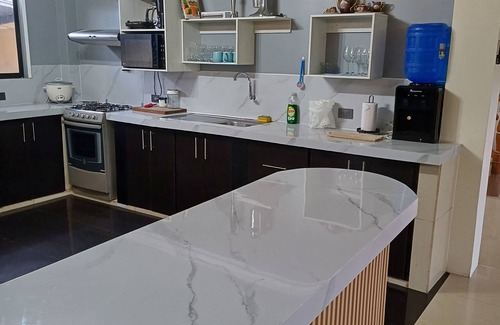 Located in San Cristóbal, two blocks from the boardwalk and a 10-minute walk to the beautiful beaches of San Cristóbal, this house is a dream. With 3 bedrooms, including 3 single beds, 2 full beds, and 1 queen bed, it's perfect for a group of friends or a family getaway. The 3.5 bathrooms are equipped with showers, towels and soaps for your convenience. Stay connected with WiFi, keep your clothes clean and dry with the washer and dryer, stay cool with the air conditioning. We hope you enjoy your stay in our fabulous home.